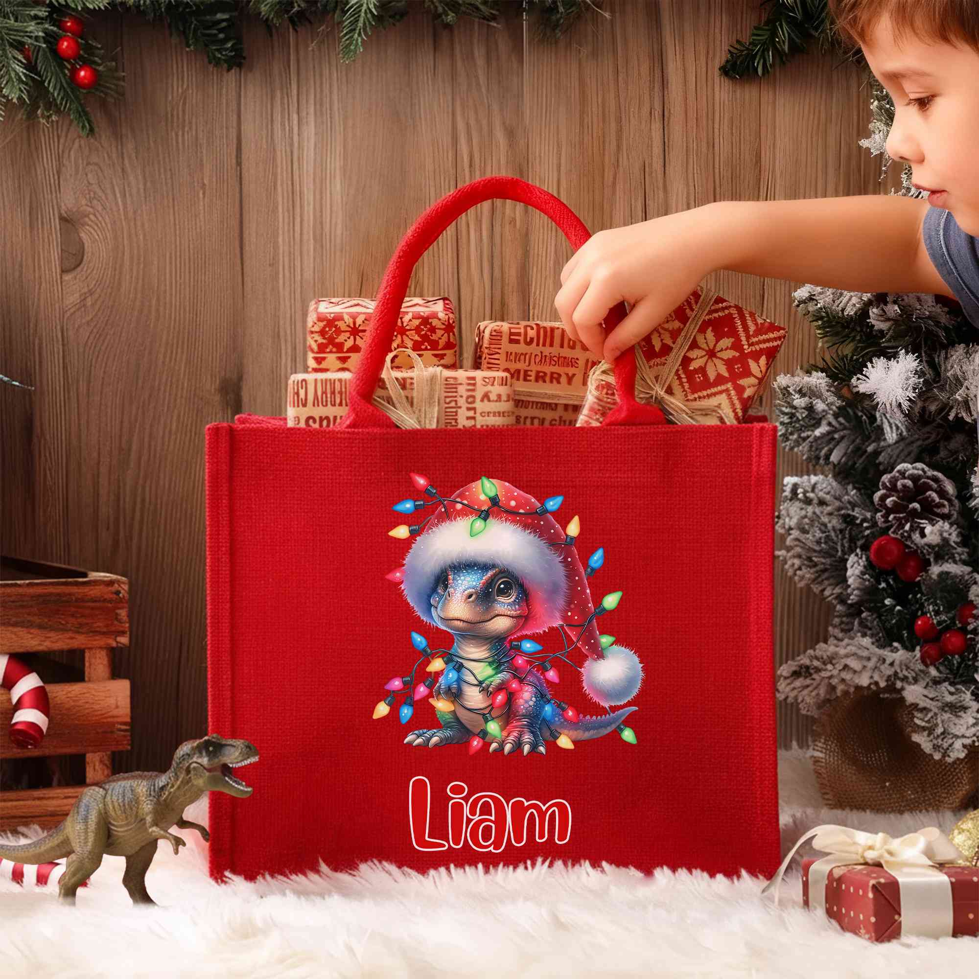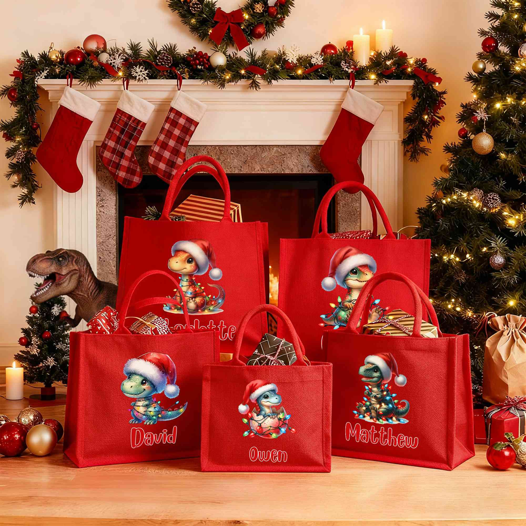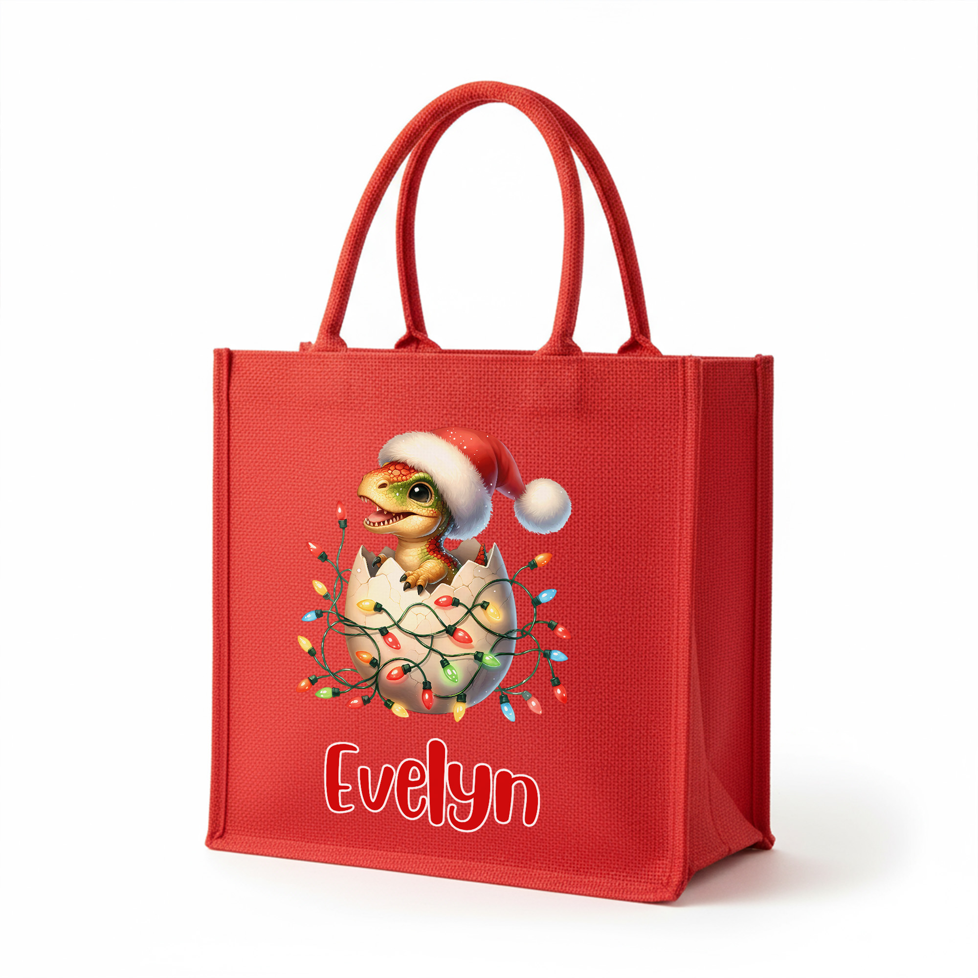 Personalized Name Cartoon Dinosaur with Christmas Lights Tote Bag, Large Capacity Red Jute Bag, Holiday Party Favor, Christmas Gift for Kids/Family
